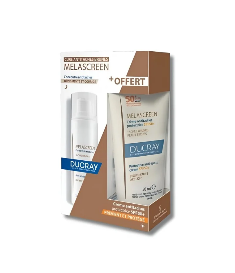 DUCRAY MELASCREEN CONCENTRE ANTI TACHES 30ML : Formulé avec des actifs dermatologiques puissants comme l'acide azélaïque, reconnu pour son action anti-taches et sa capacité à redonner de l'éclat au teint. Sa texture gel-crème légère et non grasse pénètre facilement l'épiderme, sans effet collant. DUCRAY MELASCREEN ECRAN FLUIDE ANTI TACHE SPF50+50ML (OFFERT) : Le fluide antitaches protecteur SPF50+ MELASCREEN est le 1er fluide antitaches quotidien très haute protection qui prévient et réduit l’apparence des taches brunes, tout en protégeant la peau contre les UVB, les UVA courts et longs, la lumière bleue et les effets délétères de la pollution.