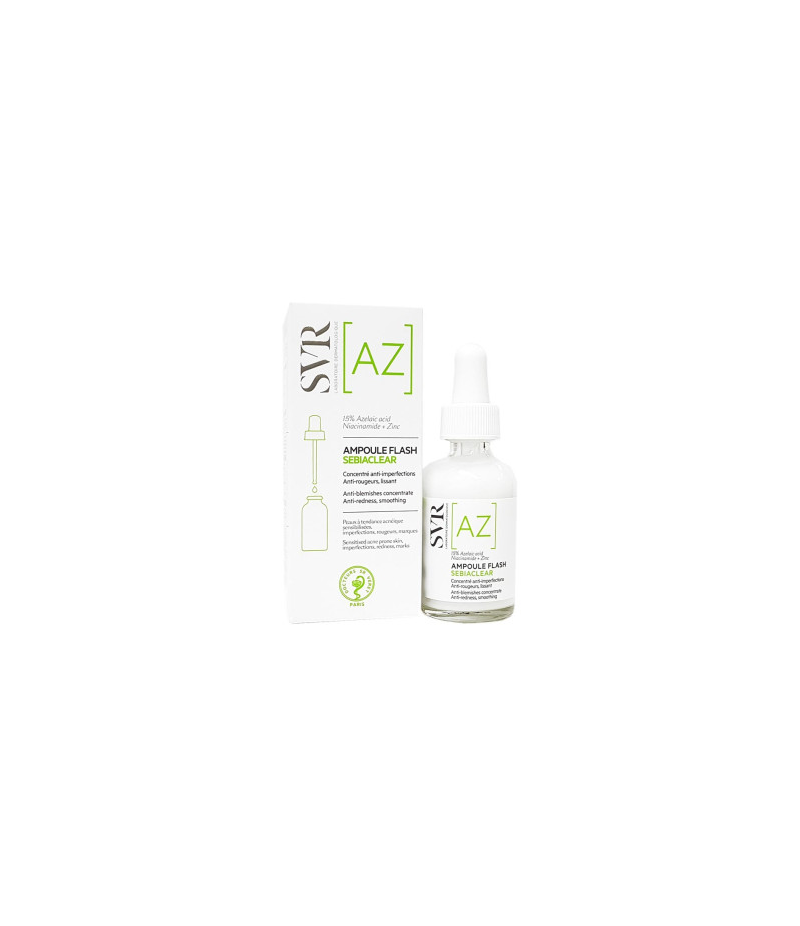 SVR Sebiaclear Ampoule Flash + Gel Moussant Offert | Votre peau respire à nouveau ! Bienfaits : SVR Sebiaclear Ampoule Flash, enrichie à 15% d’acide azélaïque, est votre alliée anti-imperfections. Elle cible les boutons, les points noirs, les rougeurs et les marques, les réduisant visiblement dès 8 heures.