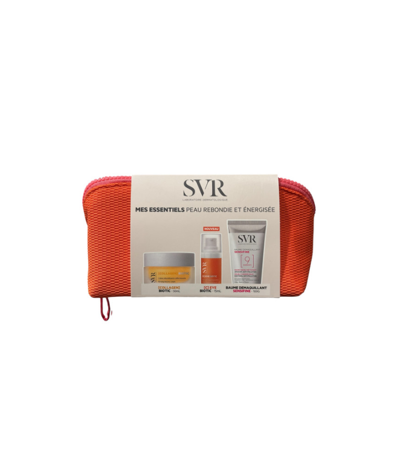 SVR TROUSSE Mes Essentiels Peau Rebondie et Energisée se compose de : SVR [Collagen] Biotic – Crème Rebondissante Raffermissante 50ML: La crème contient des probiotiques pasteurisés qui protègent et renforcent la barrière d’hydratation de la peau. L’acide hyaluronique de bas poids moléculaire hydrate et agit en profondeur pour lisser les rides et les ridules. La Vitamine C stabilisée est un antioxydant qui illumine la peau et réduit l’apparence des rides Le collagène végétal restructure issu de la biotechnologie durable, redonne élasticité et fermeté à la peau. La gomme Tara assure une action filmogène protégeant la peau des agressions extérieures et de la déshydratation. Le Beurre de Karité est riche en acides gras essentiels, en vitamines A, E qui lui confèrent des activités anti-oxydantes, anti-inflammatoires et protectrices contre les UV. Collagen Biotic SVR est une crème dotée d’une texture rebondissante à mémoire de forme. Elle nourrit, hydrate et raffermit visiblement la peau. Au fur et à mesure des jours, la peau parait plus lisse et plus lumineuse.