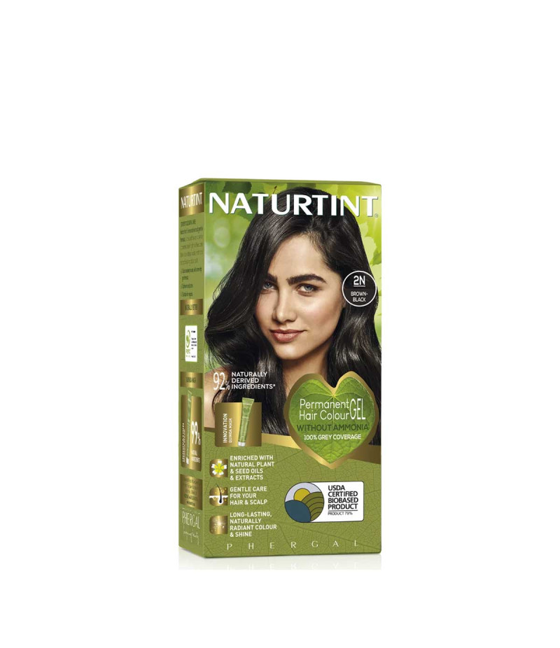 Coloration permanente avec une couverture de 100% des cheveux blancs dès la première application, dans une formule gel anti-goutte rapide et facile à utiliser, disponible en 30 nuances mélangeables. 92% d'ingrédients d'origine naturelle, y compris des huiles et des extraits de plantes et de graines soigneusement choisis pour leurs bienfaits prouvés sur les cheveux et le cuir chevelu. Sans ammoniaque, végétalien. Teinte: Brun - 2N