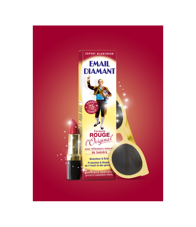Dentifrice iconique de la marque Email Diamant, la Formule Rouge, l’Original » sublime votre sourire depuis de nombreuses années. Blancheur & éclat immédiat + longue durée Cette formule unique est dotée de réflecteurs naturels de lumière pour une brillance immédiate, d’huiles essentielles et d’agents polissants très doux qui, jour après jour, éliminent efficacement les taches et aident vos dents à retrouver leur blancheur naturelle. Protection au quotidien La Formule Rouge, qui contient du fluor, renforce et protège l’émail jour après jour.