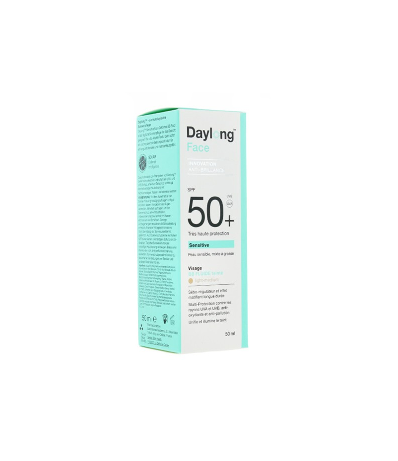 Ce BB Fluide teinté Sensitive SPF 50+ de la marque Daylong est conçu pour les peaux sensibles mixtes à grasses ou à tendance allergique au soleil, dans le but de masquer les imperfections, et de protéger des rayons UVA/UVB.
