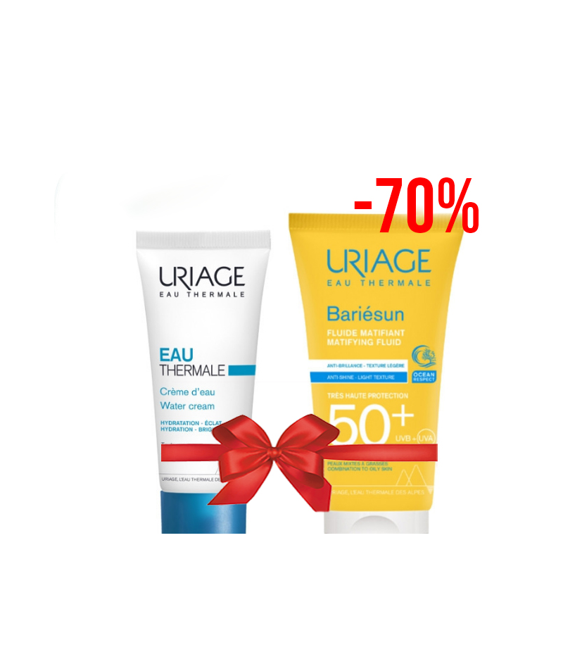 URIAGE – Crème d’Eau + Bariésun SPF50+ Fluide Mat (-70%) Ce pack Uriage associe hydratation intense et protection solaire très haute avec un fini mat, idéal pour les peaux mixtes à grasses. Une routine quotidienne complète pour une peau protégée, fraîche et sans brillance.