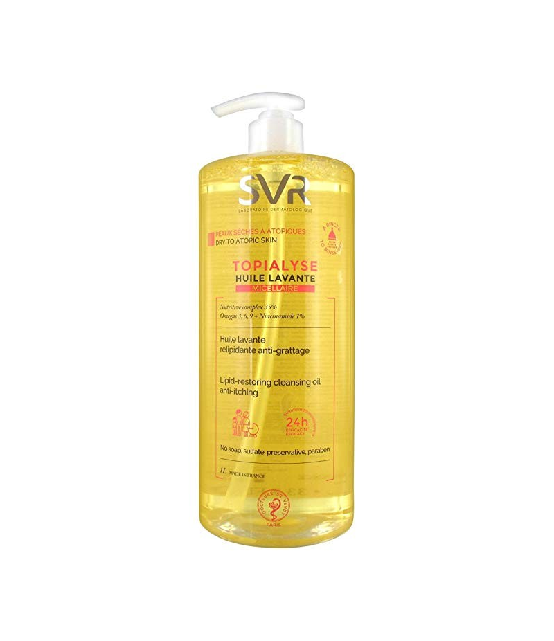SVR Topialyse Huile Lavante Micellaire 1 L est une huile lavante sans sulfate formulée à base de tensio-actifs ultra-doux pour nettoyer les peaux les plus sensibles tout en douceur et les protéger du dessèchement cutané.