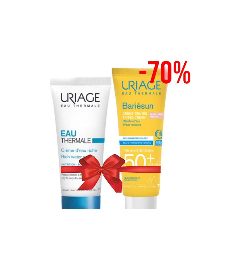 URIAGE – Crème d’Eau Riche + Bariésun SPF50+ Teintée Claire Ce pack Uriage combine nutrition intense, hydratation longue durée et protection solaire très haute avec une teinte claire unifiante. Idéal pour les peaux sèches à très sèches en quête de confort et de protection quotidienne.